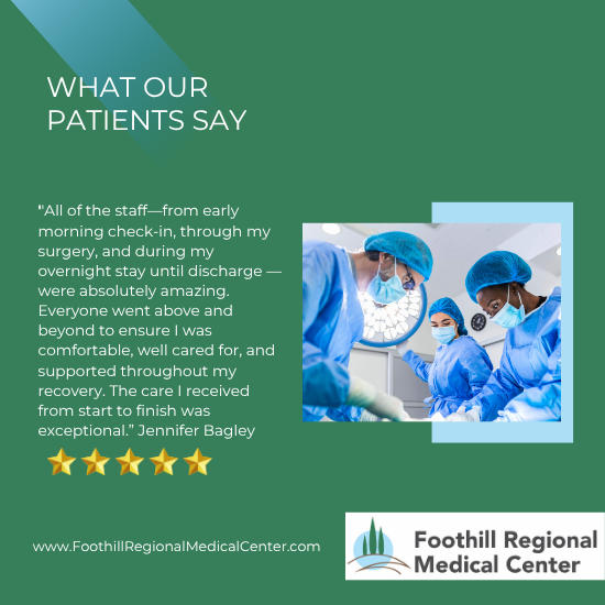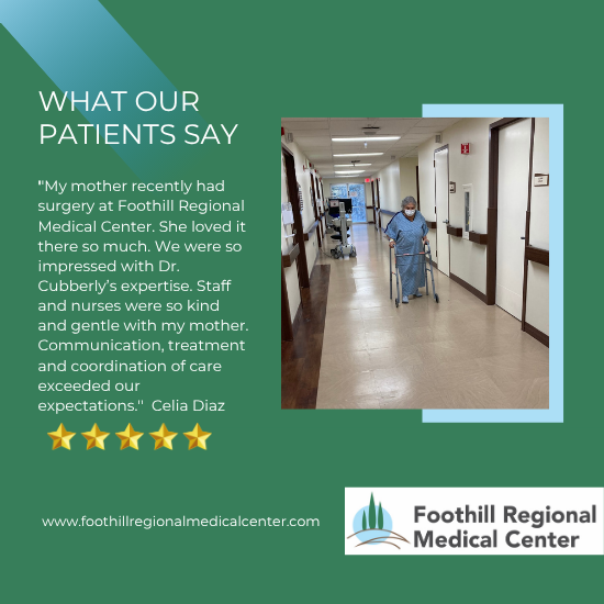 WHAT OUR PATIENTS SAY“My mother recently had surgery at Foothill Regional Medical Center. She loved it there so…